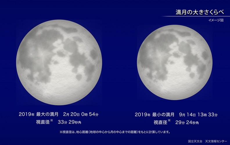 でも、上の図のように2019年最大の満月と最小の満月を比較すると、