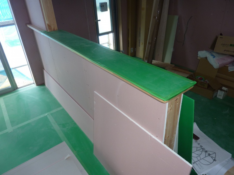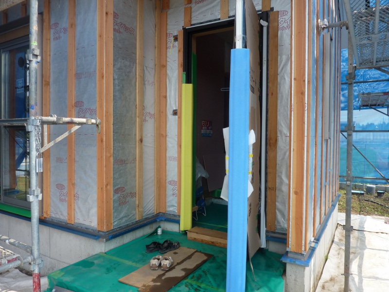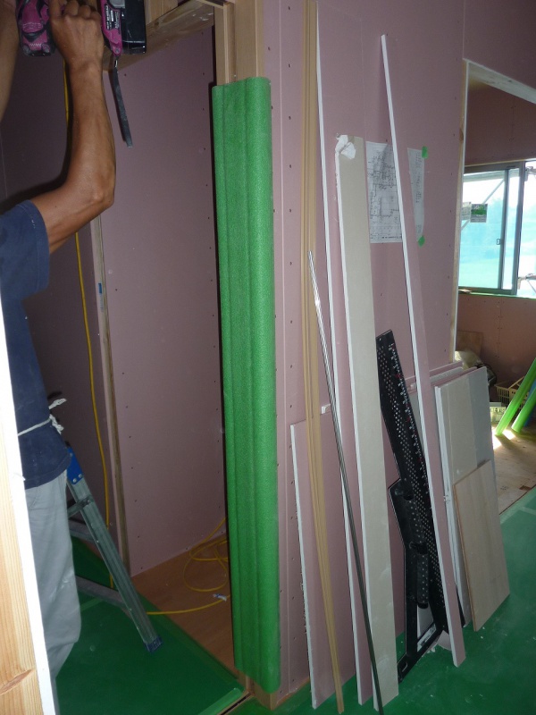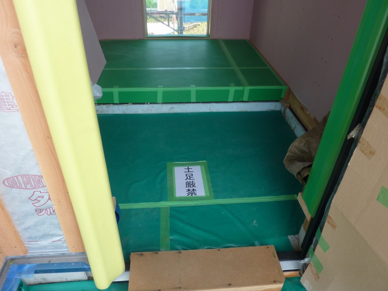 さて、工事中の現場では、黄色とか緑色の養生材がいろいろな個所で使われています。