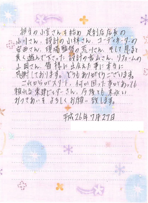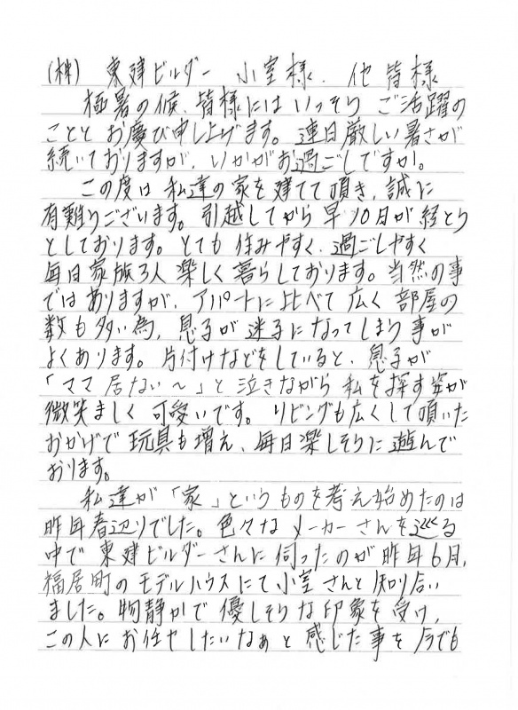 ㈱東建ビルダー小室様、他皆様 極暑の候、皆様にはいっそうご活躍のこととお慶び申し上げます。連日厳しい暑さが続いておりますが、いかがお過ごしですか。この度は私達の家を建てて頂き、誠に有難うございます。引越してから早10日が経とうとしております。とても住みやすく、過ごしやすく毎日家族3人楽しく暮らしております。当然の事ではありますが、アパートに比べて広く部屋の数も多い為、息子が迷子になってしまう事がよくあります。片付けなどをしていると、息子が、「ママ居ない~」と泣きながら私を探す姿が微笑ましく可愛いです。リビングも広くして頂いたおかげで玩具も増え、毎日楽しそうに遊んでおります。私達が「家」というものを考え始めたのは昨年春辺りでした。色々なメーカーさんを巡る中で東建ビルダーさんに伺ったのが昨年6月、福居町のモデルハウスにて小室さんと知り合いました。物静かで優しそうな印象を受け、この人にお任せしたいなぁと感じた事を今でも覚えております。しかしながら購入した土地の関係上、別の会社と仮契約を結びました。そちらの会社と打ち合わせ始まり3ヶ月位経つうちに、徐々に不満が生じ本当にこのままこの会社で建ててしまっていいのだろうかと悩み始めました。そして数ヶ月ぶりに小室さんに連絡をし、心に溜まっていた不満を全てぶつけてしまいました。一度離れた私の話を親身になって聞いて下さり、改めて小室さんの優しさを実感しました。そして久しぶりに東建さんを訪れ、そこからはすんなり契約まで進みました。息子の誕生日には好きなキャラクター絵本を下さったり、打ち合わせの際のメッセージカードなどもすごく嬉しく常に皆様の温かさを感じておりました。工事期間中、現場は常にキレイで毎日朝早くから頑張って下さった大工さん、業者の皆様にも感謝の気持ちでいっぱいです。引越した今でも近所の人達に良い業者さんだったと褒められ、私も嬉しくなります。担当の小室さんを始め、足利店店長の小川さん、設計の小林さん、コーディネーターの安西さん、現場監督の荒川さん、そして息子と良く遊んで下さった設計の香山さん、リフォームの山岡さん、皆様に出会えた事に本当に感謝しております。どうもありがとうございます。これからがスタート、何か困った事があっても頼れる東建ビルダーさん、今後とも末永いおつきあいをよろしくお願い致します。 平成26年7月27日
