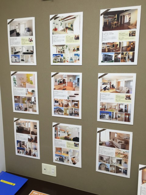 小山店では施工例として実際に弊社で建てられたお客様のお家の写真やインタビューの内容をお店の壁に飾っています。