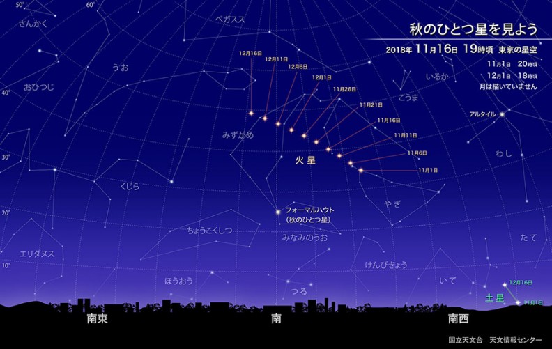 季節が秋から冬へと移り変わるこの時期、夏の星座が西の空に傾き、南の空には秋の星座が昇ってきています。1等星がたくさんある夏の星座に比べ、秋の星座の1等星は、みなみのうお座のフォーマルハウトただ一つしかありません。フォーマルハウトの東京での南中高度は25度ほどと、さほど高くはありませんが、周囲に明るい星がないためよく目立っています。そして、ぽつんと輝くその姿は「秋のひとつ星」とも呼ばれています。少々寂しいイメージの呼び名ではありますが、今年は南の空に火星も加わり、秋の夜空に彩りをそえています。11月中旬の東京では、フォーマルハウトは19時頃に南中します。11月の初め頃、火星はフォーマルハウトの右上の方に見えていますが、星座の中をどんどん東に移動していき、12月上旬にはフォーマルハウトとほぼ同じ頃に南中するようになるそうです。