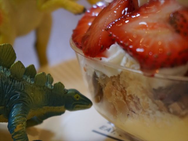 そしてこの研修を終えた私の写真はどうでしょうか。恐竜とケーキの競演で撮ってみました。