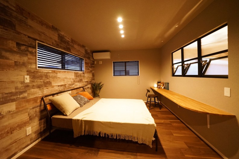 主寝室の壁一面には古材風のアクセントクロスを貼って