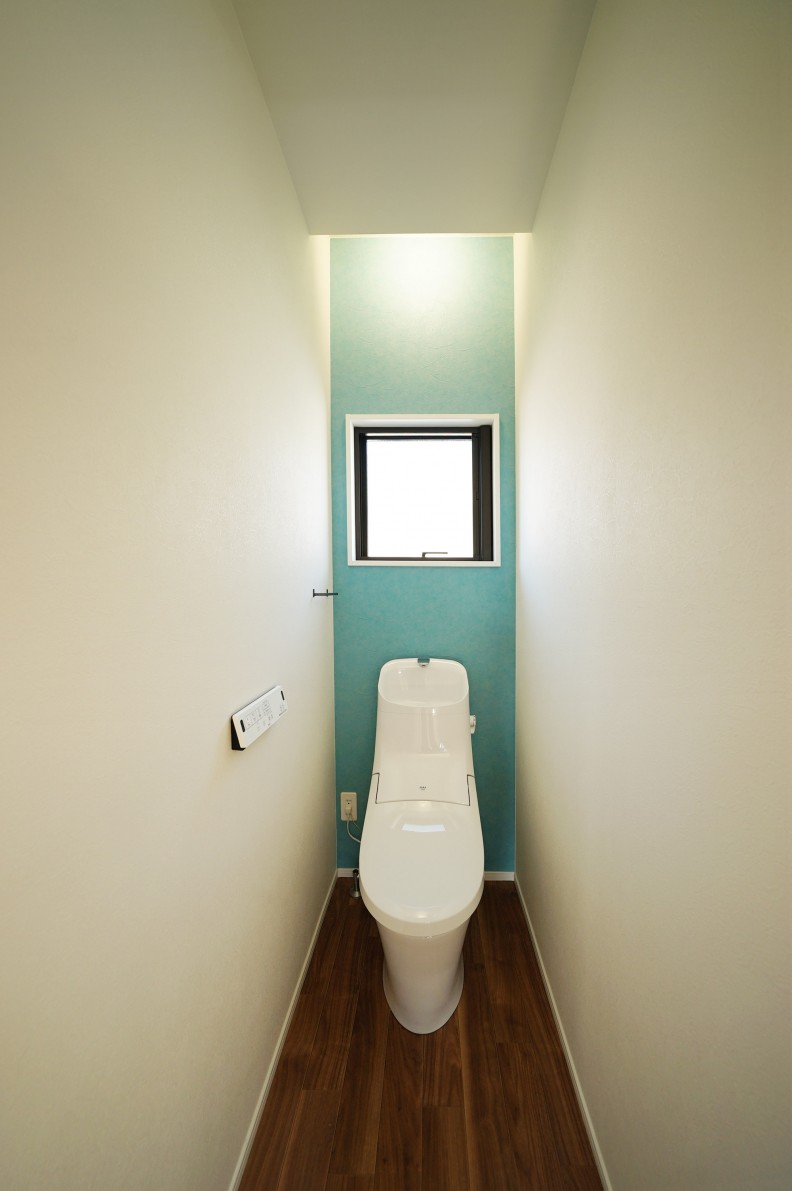 鮮やかな水色のアクセントクロスを背面に貼り、