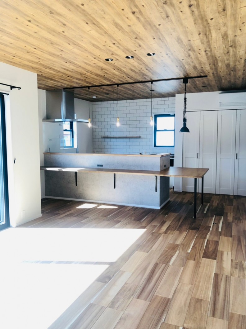 天井も奥行を感じる貼り方に、床色と合っていて統一感が出ています。
