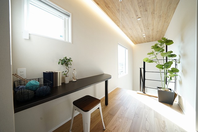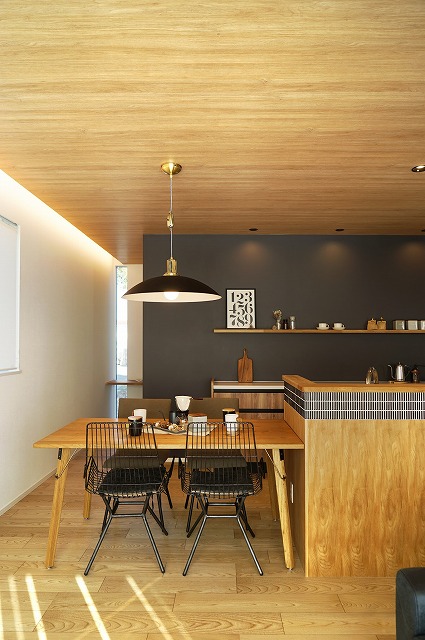 こちらはヴィンテージ感のある木目柄をLDKの天井に貼っています。