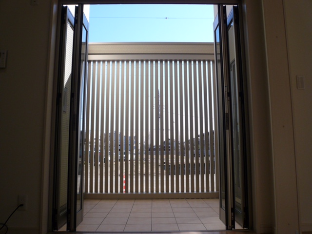 中庭にスクリーン格子を設置する事で、リビングをオープンにしてもプライバシーが保たれ、