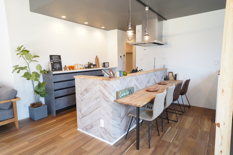 また、キッチン腰壁部分にへリンボーン柄のアクセントクロスを使用することで