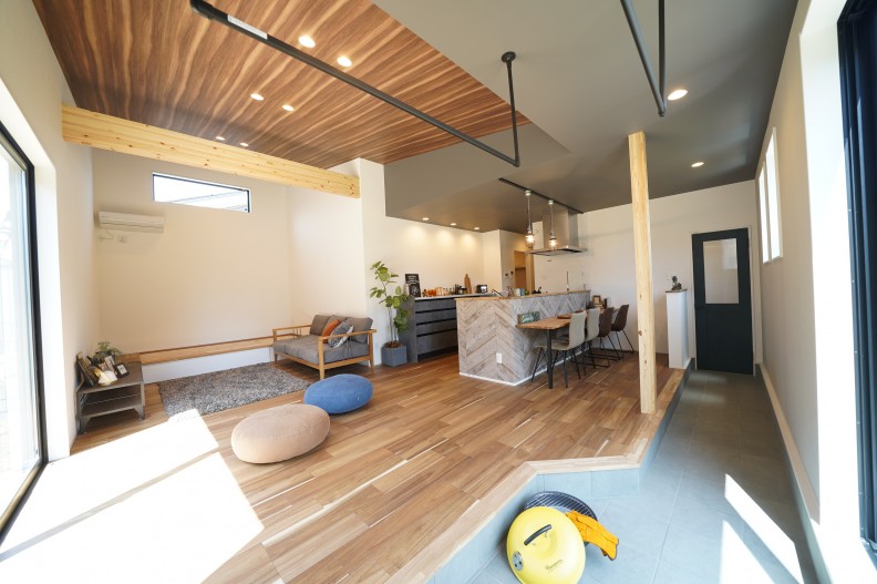 リビング土間・勾配天井を設けて広々した空間が作られています。