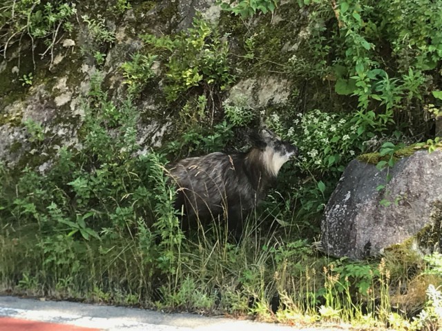 人間がすぐ近くを通っても全く動じないで草を食べるカモシカ
