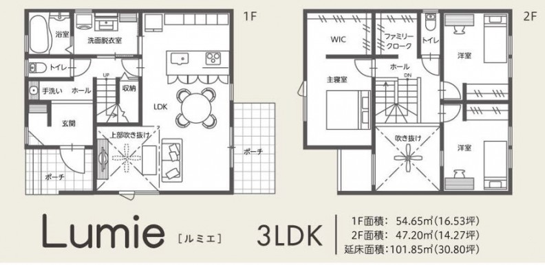 19帖のリビングは吹き抜けとL字にすることで生活感を減らしスッキリ見えます。