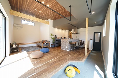 土間+小上がり+勾配天井で大空間に広がるLDK
