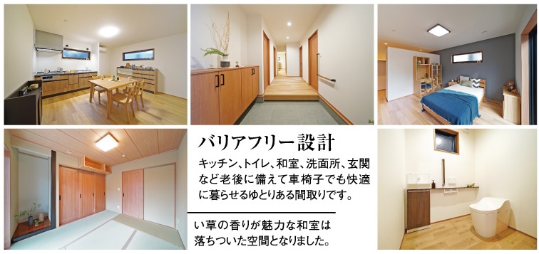 キッチン、トイレ、和室、洗面所、玄関など家全体に老後に備えたバリアフリー設計