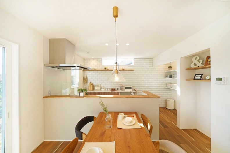 白を基調として木の風合いが優しいナチュラルモダンな内観