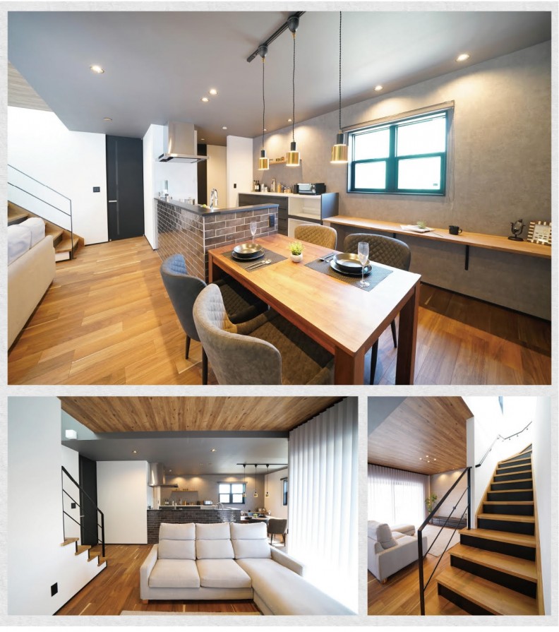 アクセントタイルの腰壁キッチンとアイアン階段が印象的なおしゃれなLDK