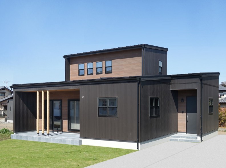 黒いガルバにアクセントで木目を使ったスタイリッシュモダンな外観