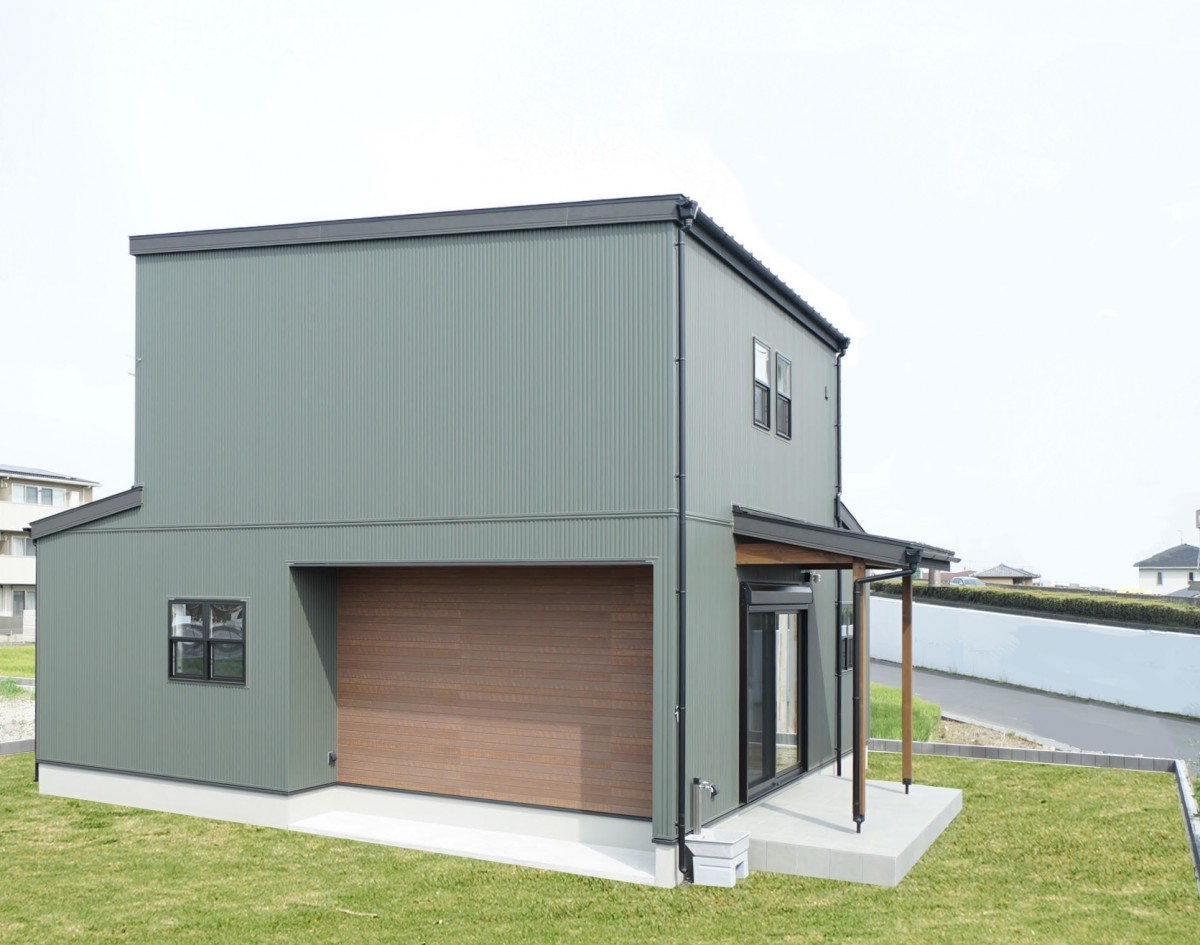 ミストグリーンの外壁にアクセントで木目を使ったシンプルモダンな外観
