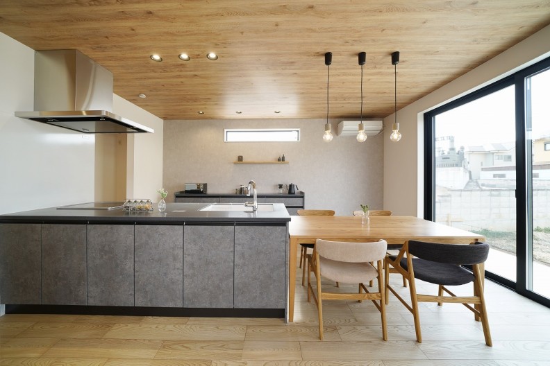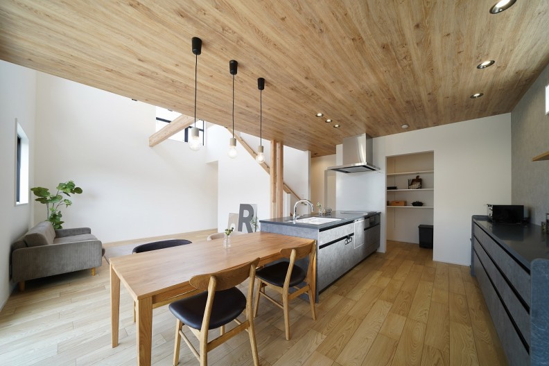 開放感のある吹き抜けリビングとフラットキッチンが家族団らんの時を刻みます。