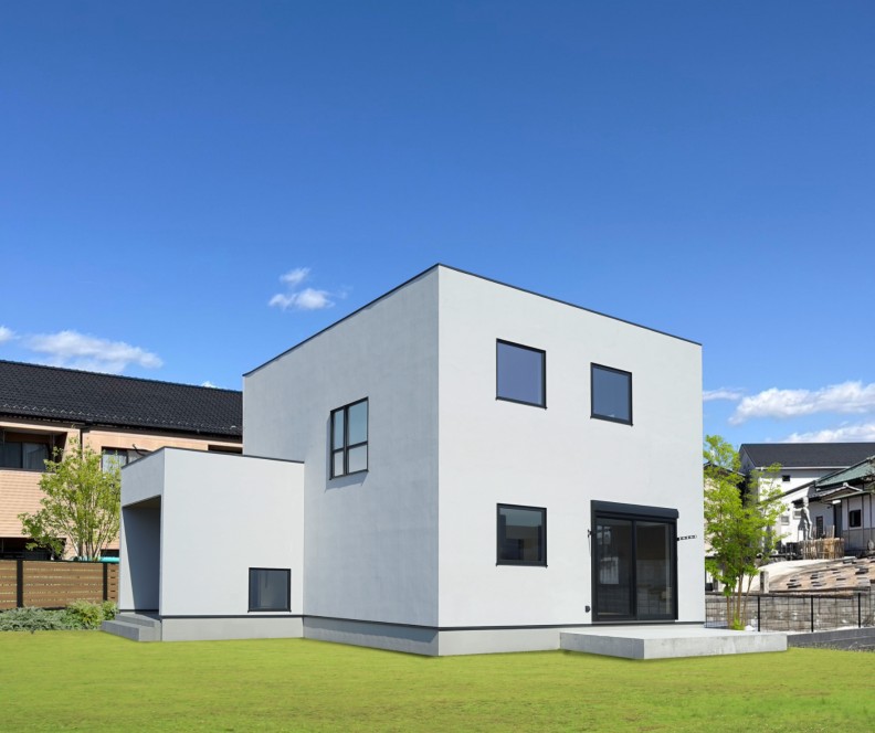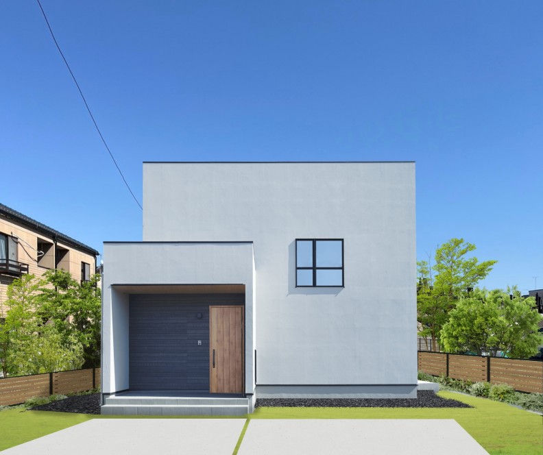 グレイの塗り壁のCUBE型のシンプルモダンのかっこいい外観