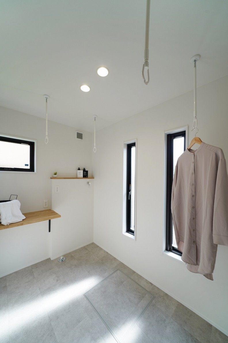 洗濯スペースと物干しスペース、作業カウンターの整った広々ランドリースペースなら雨や風、花粉やホコリの心配もなくプライバシーも守れます。