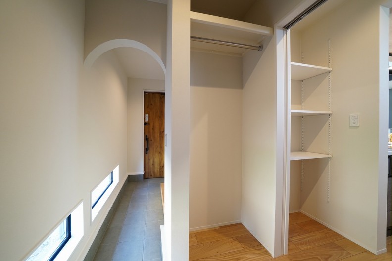 家族用玄関はそのままパントリーを通ってキッチンへ行ける動線となっています。