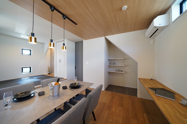 壁の造作カウンターはお茶やちょとした作業に便利なカフェスペース。