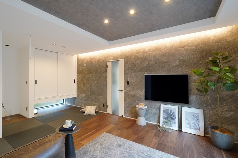 リビンクの広い壁面には重厚感のあるエコカラット。