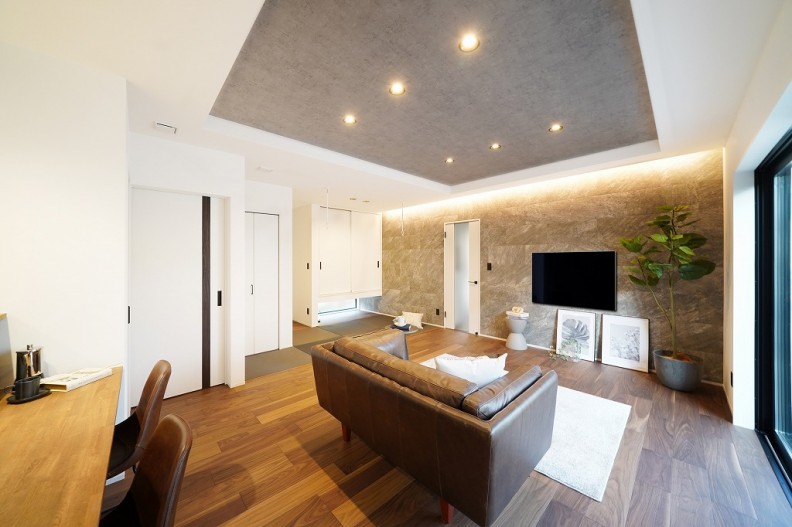 リビングは折り上げ天井にしたことでお部屋全体をより広くスタイリッシュな雰囲気になりました。