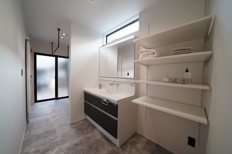 外干しできるポーチと洗う・干す・畳むができるランドリールーム、洗面所、お風呂の水まわりが直線でつながり、キッチンからも回遊できる家事楽回遊動線です