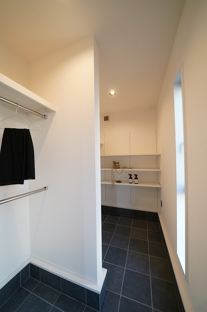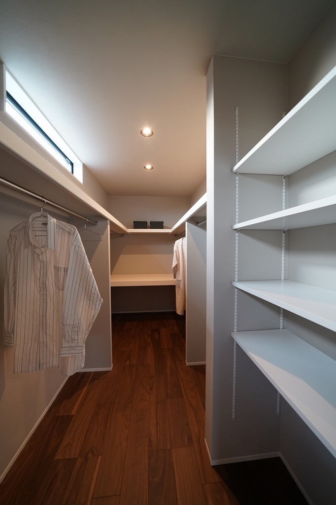 玄関奥にはアウターを掛けるコーナーとシューズクローク、水まわりにはファミリークローク、階段下を活用した大きな収納、主寝室には大容量ウオークインクローゼットなど収納アイデアがたくさんの間取りです。