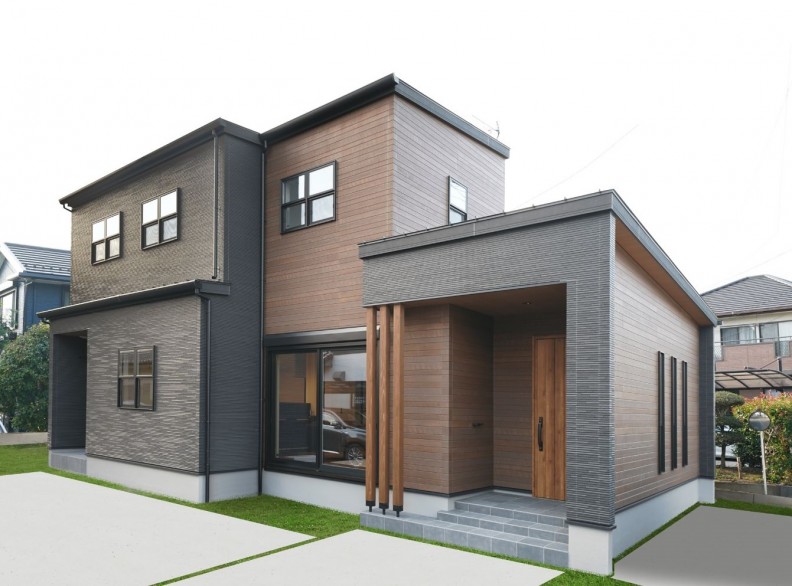 ブラックの外壁にアクセントで木目調を使ったスタイリッシュな外観