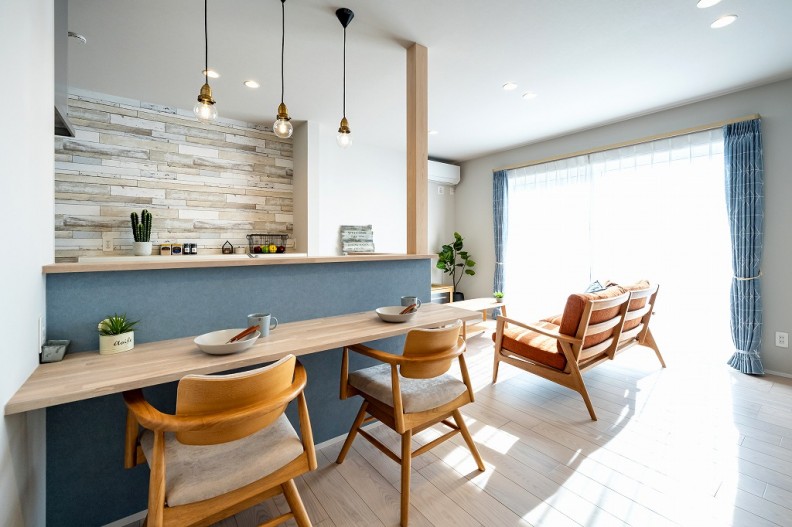 キッチン前のカウンターや照明デザインがアクセントになり、