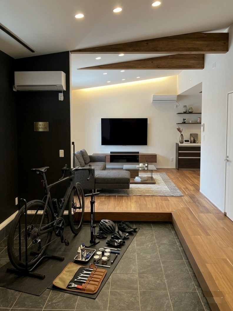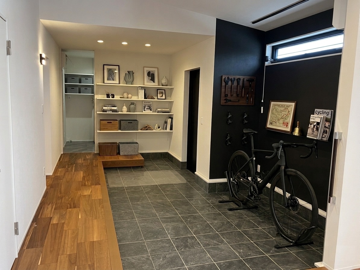 ガレージのような機能性: 玄関からそのまま自転車を運び込める広々とした土間。壁面には工具やパーツを効率よく配置できるブラックのアクセントウォールを採用。