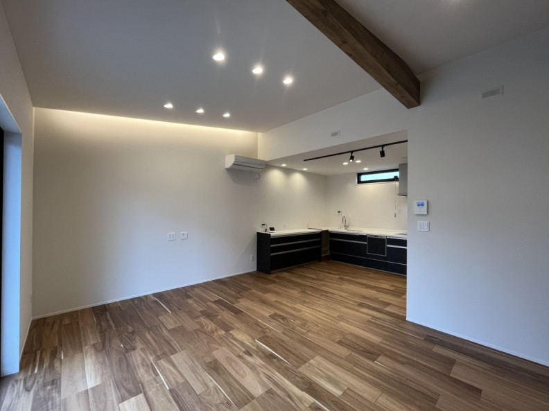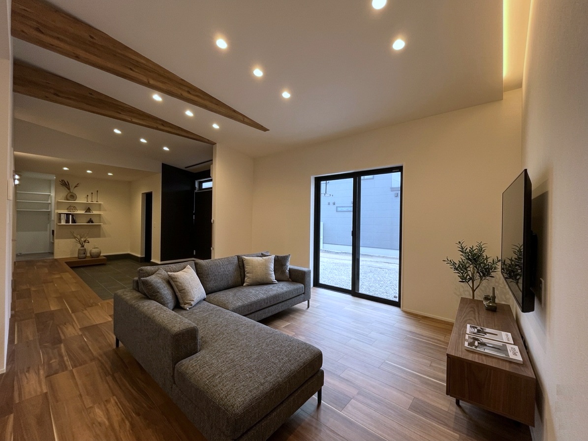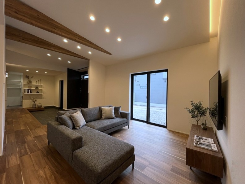 室内は勾配天井と化粧梁、こだわりの間接照明が都会的でありながら温かみのある空間を演出。