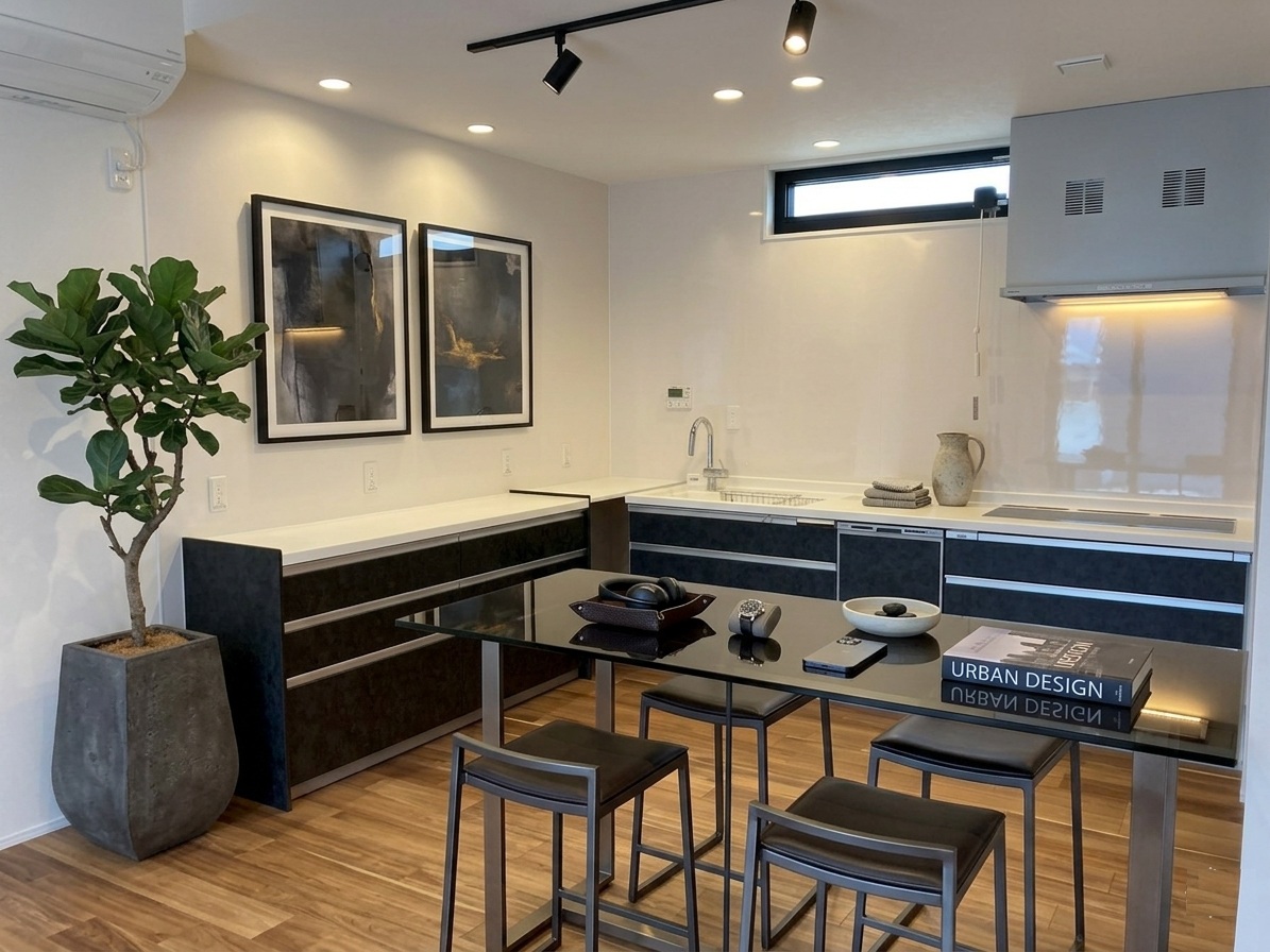 広いリビングの確保: あえて壁付けにすることで、ダイニング・リビングエリアを分断せず、大きなソファやガラステーブルを置いても余裕のあるレイアウトを可能にしました。