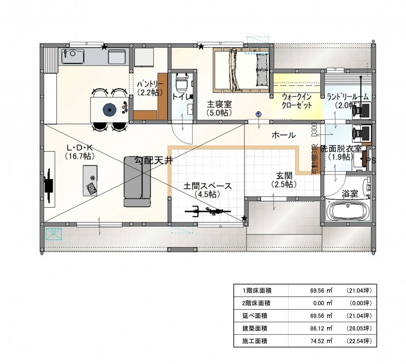 垂直方向の広がり: 平屋のメリットを活かした高い勾配天井が、平米数以上の広さと高さを演出。