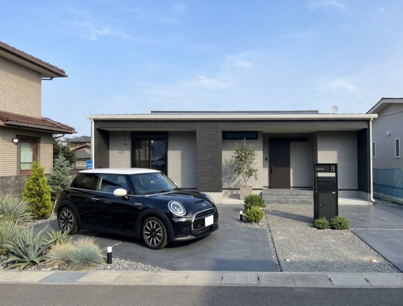 深い軒とフラットな屋根ラインが、落ち着きと重厚感、そして現代的なスタイリッシュさを演出します。