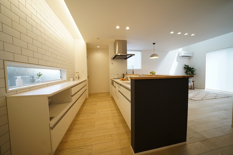 ホワイトのタイルと間接照明ですっきり感と清潔感のあるキッチンスペース。