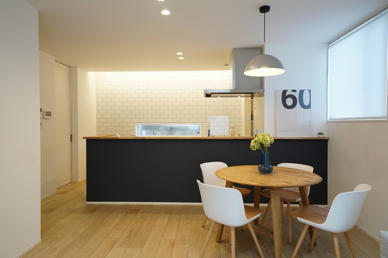 ブラックのクロスを横長に使用した事で、空間のアクセントになり、横幅を広く感じさせます。