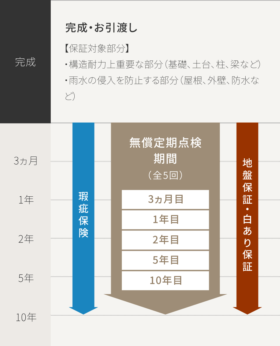 これにより、「構造耐力上重要な部分」または「雨水の侵入を防止する部分」に欠陥が発生した場合、 10年まで補修または賠償が保証 されます。また、最長20年まで延長することができます。