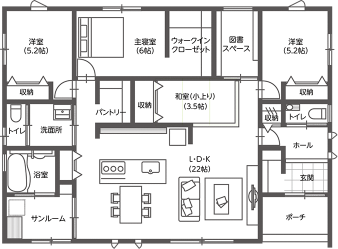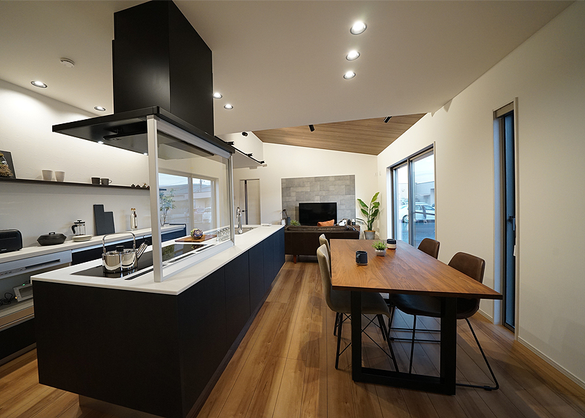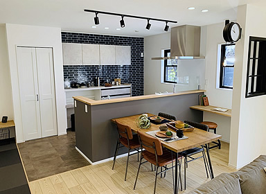 ぐるぐる回れる快適な家事導線と陽の光がいっぱい降り注ぐLDKで笑顔が絶えない家族にぴったりのお家に仕上がりました。キッチン横にダイニングテーブルを置いたことで、熱々の料理をすぐに運べて、お⽚付けもスムーズに。