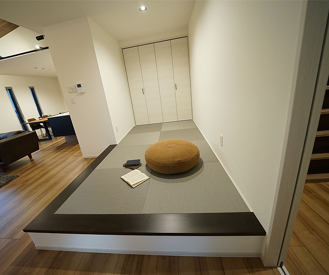 和室の床を上げたことで空間に仕切りを持たせることが出来ました。モダンなインテリアに合わせた和の空間がお洒落です。