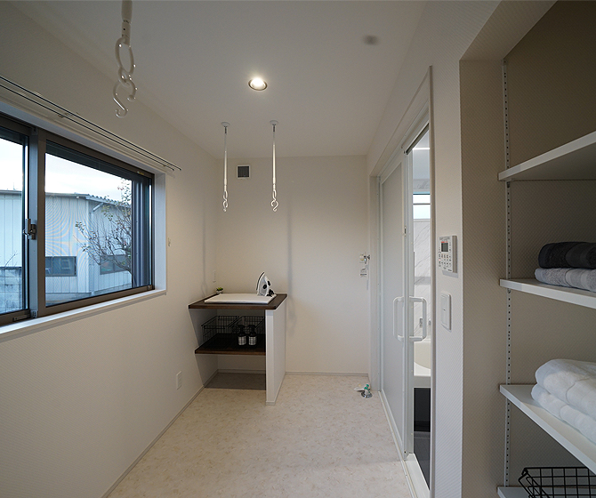 キッチンはアイランド型。サンルームになっているので、その場で干せます。アイロンもかけられるスペースも設置。