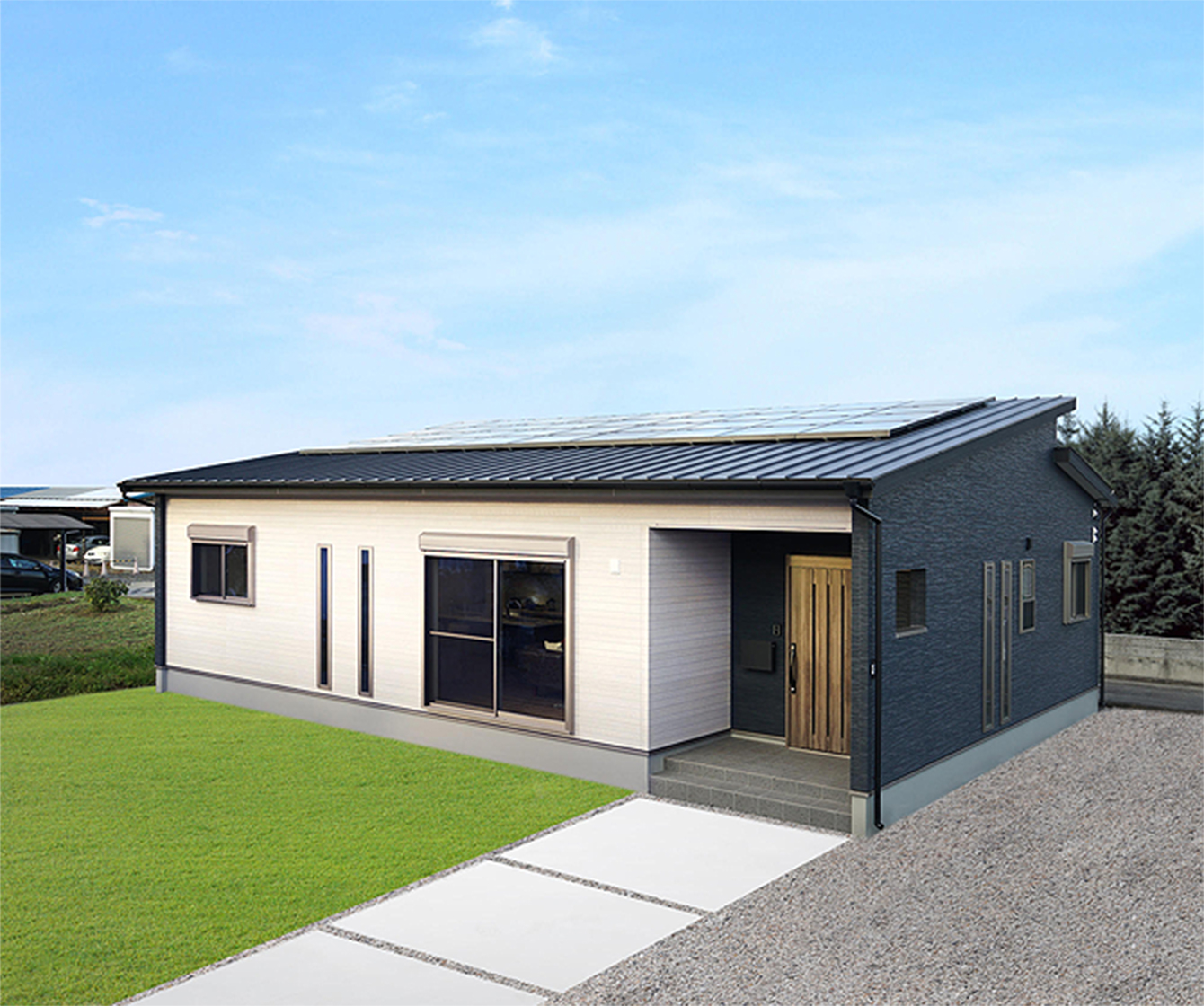 ツートンカラーでスタイリッシュな外観。地球と家計にも優しいZEH(ゼロ・エネルギー・ハウス)のお家。