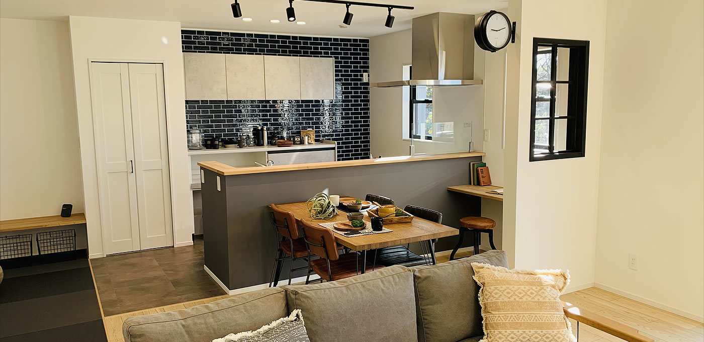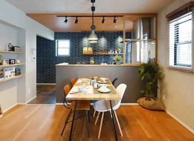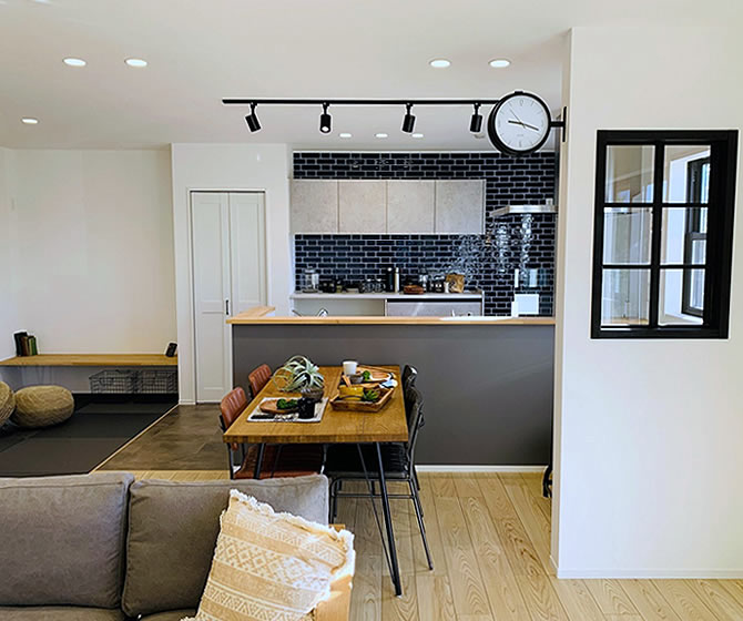 表情豊かなブルーのアクセントタイルのキッチンに、優しく明るい風合いの広々としたLDKは黒染めの和紙畳の和室スペースと繋がります。