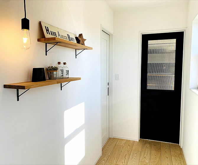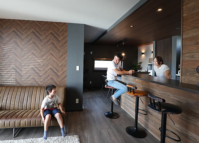 「ヴィンテージ」「アンティーク」「素材感」をキーワードに、古いものと新しいものを融合したおしゃれなカフェやバーにいるような男前なお家になりました。古材の⾵合いを⽣かした質感がおしゃれなヴィンテージ⾵のアイテムを豊富に使っています。