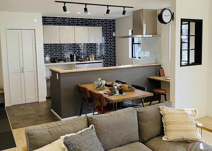 ぐるぐる回れる快適な家事導線と陽の光がいっぱい降り注ぐLDKで笑顔が絶えない家族にぴったりのお家に仕上がりました。キッチン横にダイニングテーブルを置いたことで、熱々の料理をすぐに運べて、お⽚付けもスムーズに。