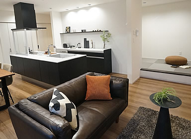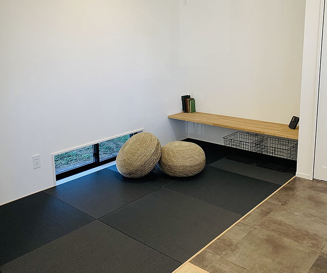 キッチン横に黒染めの和紙畳がおしゃれな和室スペース。
