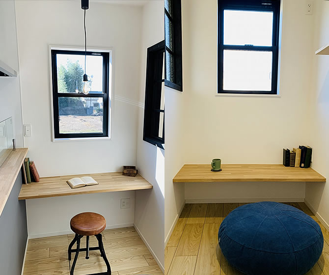 奥様のホッと一息デスクスペース。お庭を眺めながら、お茶や読書に。