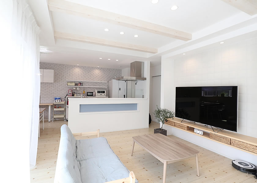センのフローリングを敷いた広々としたLDKは明るい色合いを出し、木の温もりで寛ぎの空間へ。